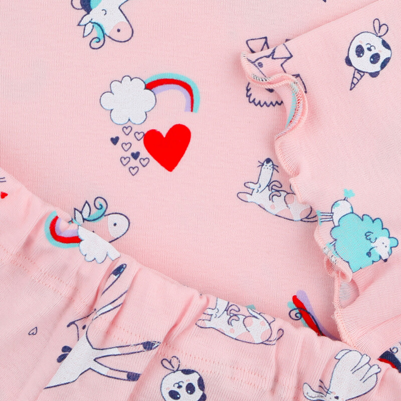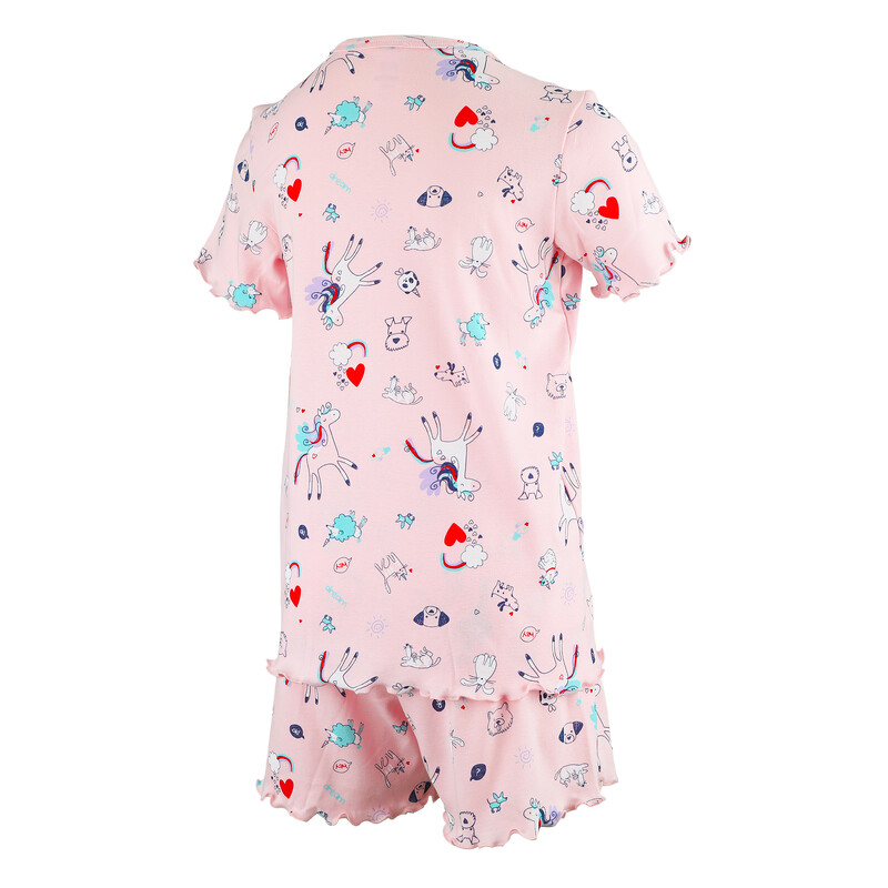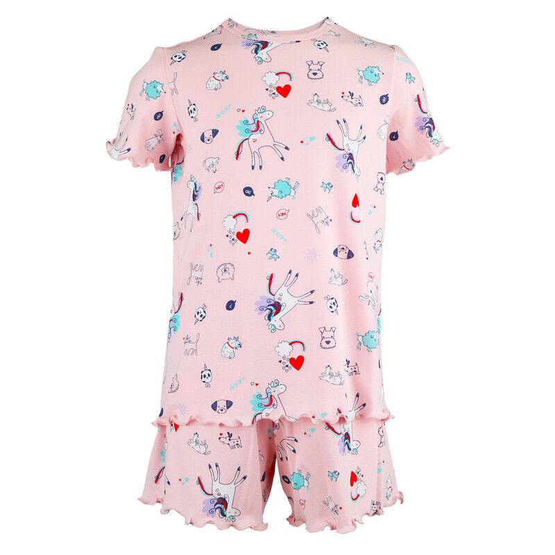 Dívčí pyžamo s krátkým rukávem s decentním potiskem na vrchním díle. Kraťasy s navlíkací gumou v pasové části.