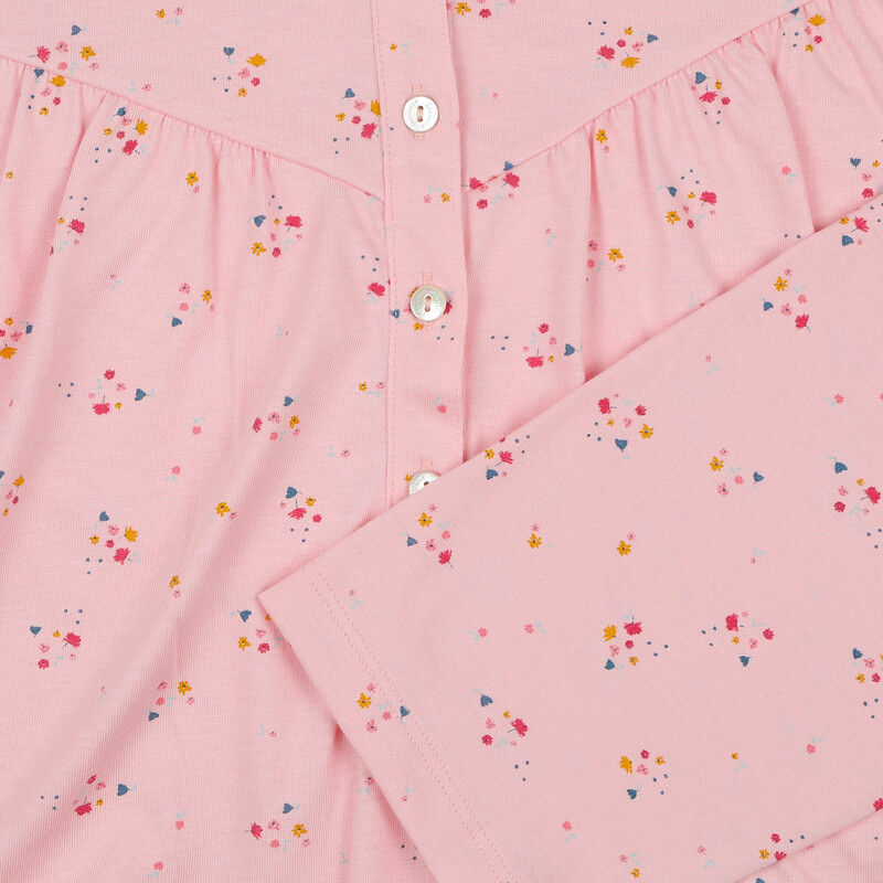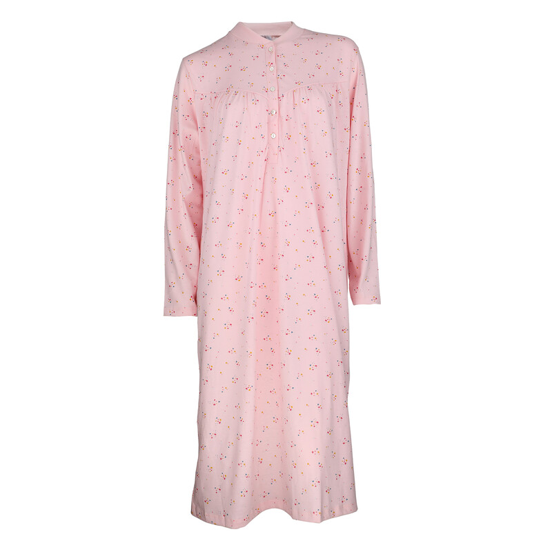 Dámská noční košile s dlouhým rukávem, kulatým výstřihem a propínací légou.