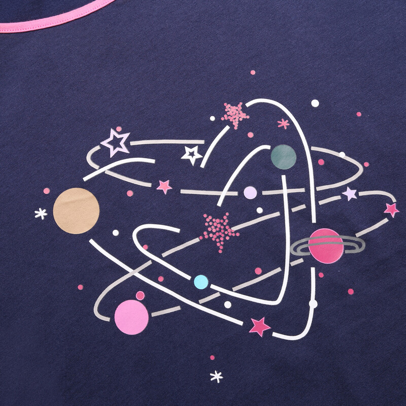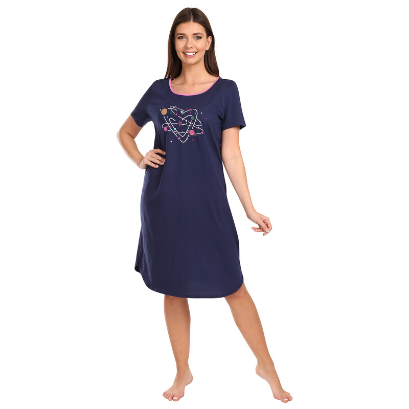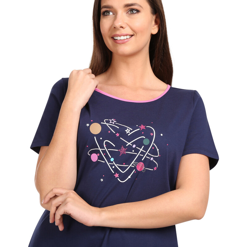 Dámská mladistvá noční košile střední délky s kontrastním kulatým výstřihem a krátkým rukávem. Košile má zakulacený dolní lem a velký potisk. Délka : od výstřihu / zadní díl pro vel.38/S = 96 cm ; u každé další velikosti cca + o 1 cm více než předchozí velikost