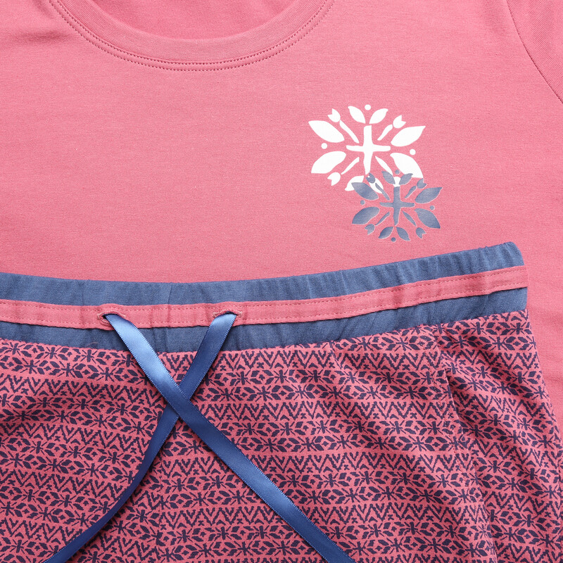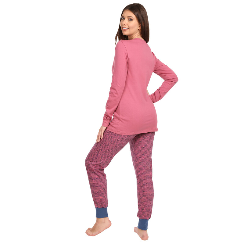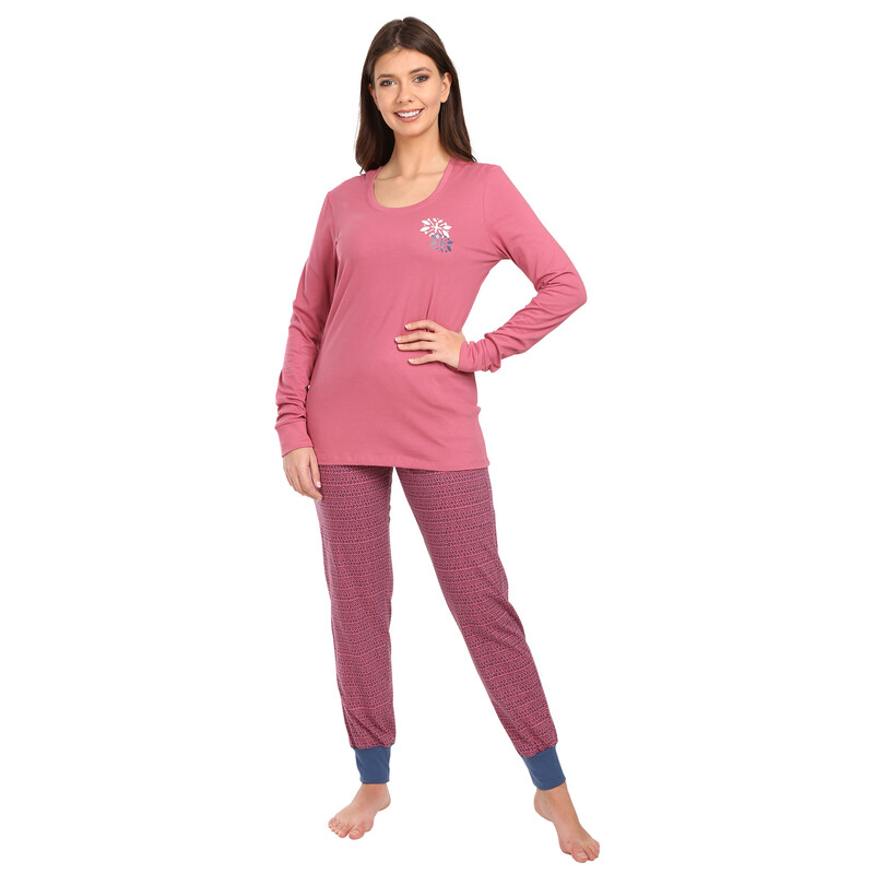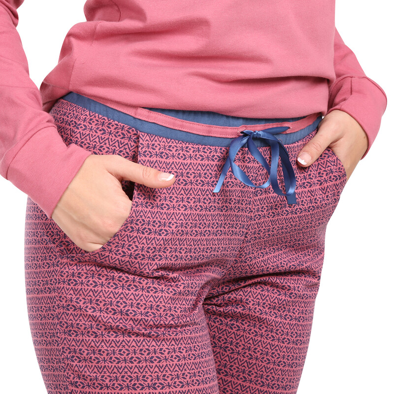 Krásné dámské pyžamo s dlouhým rukávem s náplety a kulatým výstřihem. Kalhoty mají zavazovací stužku v pase a nohavice jsou rovněž zakončeny náplety. Horní díl je ozdoben decentním potiskem.